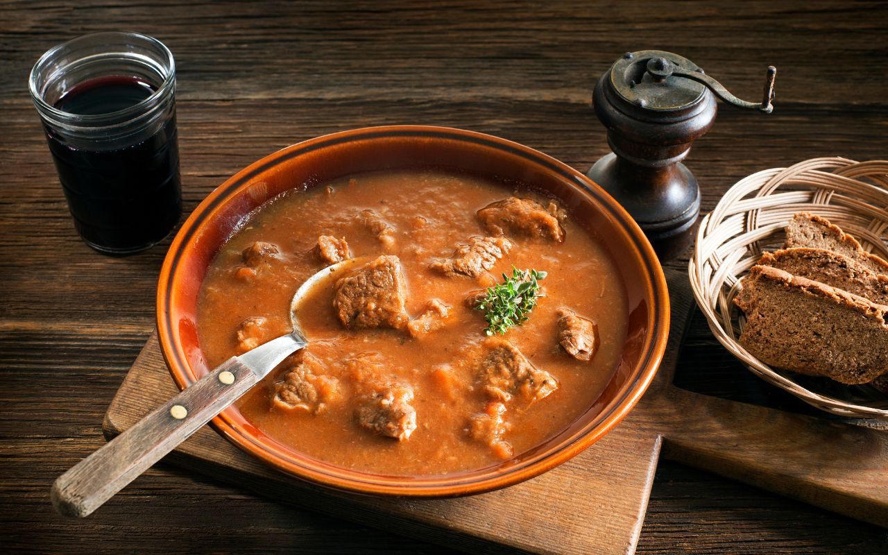 La tradizione parla oltre che di Tokaji anche di Gulash ungherese, o meglio Gulyas-leves, la “zuppa del mandriano”, perché tipica della regione del Danubio nel distretto del Matra. È una sorta di spezzatino di carne di manzo, con una preparazione di diverse ore, cotto a fuoco lento, con soffritto di cipolle, lardo, patate e paprika: il vero re della cucina ungherese. Ricco e sostanzioso, nonché speziato, tipicamente abbinabile ai bianchi corposi ed aromatici che smorzano la componente speziata, come le varietà autoctone di Olaszrizling, Leányka, Ottonel Muscat, Szürkebarát, oppure internazionali come il Sauvignon Blanc.