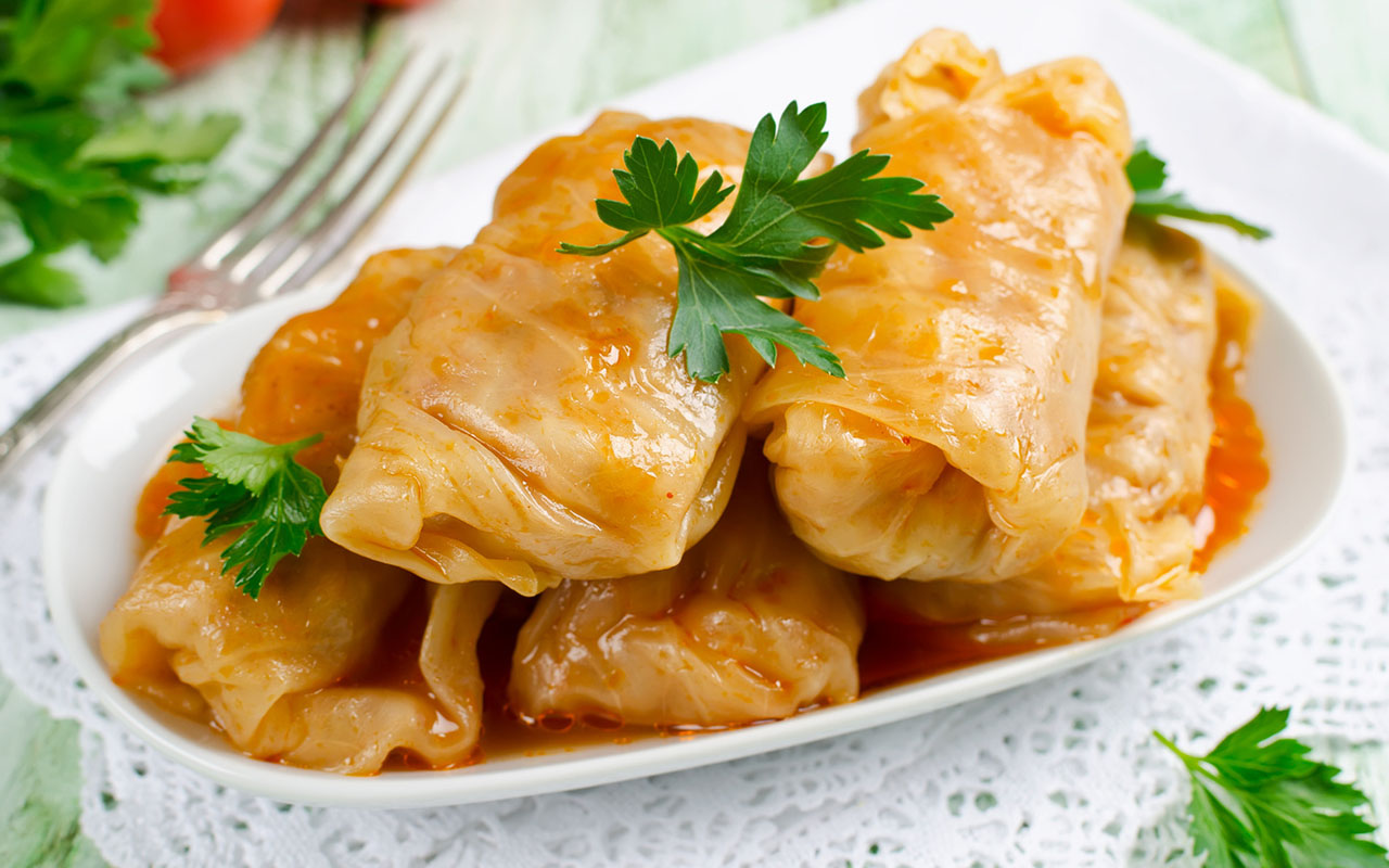 I tipici involtini di cavolo, Toltott Kaposzta, piatto semplice a base di foglie di cavolo riempite di carne tritata, cipolla e riso, cotto e servito con i crauti, facile da abbinare ai rossi corposi, tagli bordolesi della zona di Villany, oppure agli Zweigelt qui provenienti dalla regione del Danubio, rosso, dalle note balsamiche di ciliegia ed amarena, tannini setosi, medio corpo ed acidità bella rinfrescante.