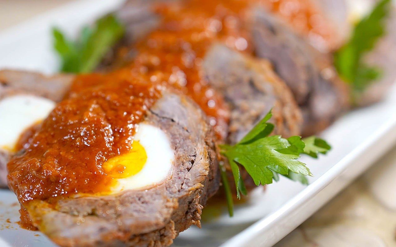 Si prosegue poi con il falsomagro: un rotolo con un ripieno importante, fatto di salsiccia, formaggio, prezzemolo e cipollotti, il tutto adagiato su una bella fetta di mortadella (nel catanese) o di pancetta.
